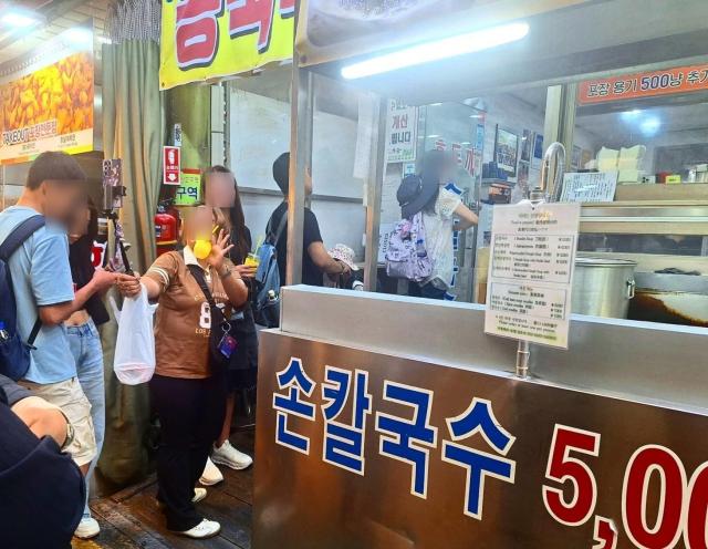 Du khách nước ngoài đứng chờ tới lượt vào dùng bữa ở một quán ăn tại chợ Mangwon, Seoul. [Ảnh=Internet]