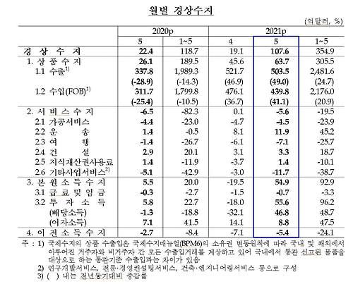 Theo thống kê cán cân thanh toán tạm thời do Ngân hàng Trung ương Hàn Quốc (BoK) công bố vào ngày 7, thặng dư tài khoản vãng lai trong tháng 5 là 10,76 tỷ USD (khoảng 12,21 nghìn tỷ won).