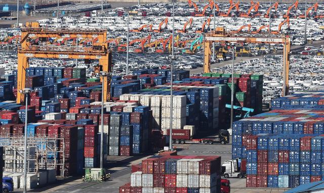 Các container được xếp chồng lên nhau tại cảng Pyeongtaek, tỉnh Gyeonggi. [Ảnh=Yonhap News]