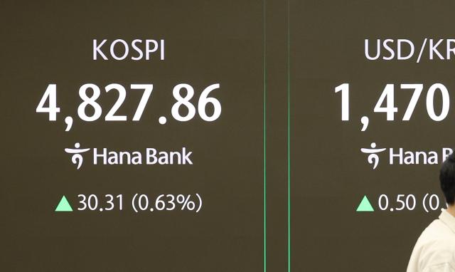 Chỉ số KOSPI được hiển thị trên bảng thông báo tại phòng giao dịch của Ngân hàng Hana ở quận Jung-gu, Seoul, ngày 16 tháng 1. Chỉ số KOSPI mở cửa ở mức 4.820,66, tăng 23,11 điểm (0,48%) so với ngày hôm trước. [Ảnh=Yonhap News]