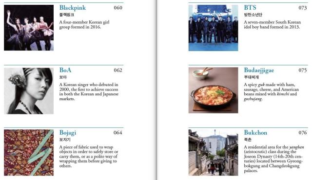 Các mục từ bao gồm các nhân vật dân gian như dokkaebi (yêu tinh) và jeoseung saja (thần chết) đến các dấu ấn văn hóa đương đại như mukbang (buổi phát sóng về việc ăn uống), fandom (tập hợp nhóm người hâm mộ) và light stick (gậy cổ vũ), được giải thích không chỉ đơn thuần là hàng hóa mà còn là biểu tượng của văn hóa người hâm mộ tham gia tích cực của Hàn Quốc.